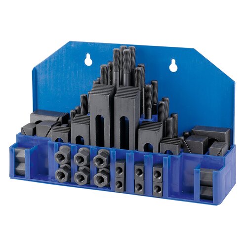Art.Nr.: 28-100458-teiliges Basissortiment mit den am meisten benötigten Spannelementen zum schnellen Aufspannen von Werkstücken oder Vorrichtungen auf T-Nutentischen.