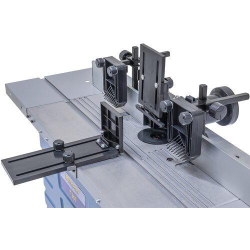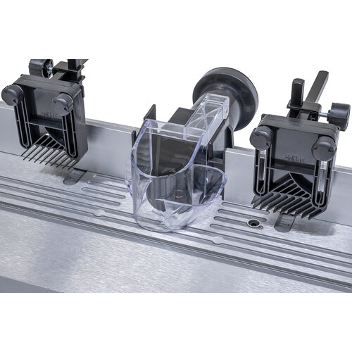 - Die Fräserschutzhaube ist mit eloxierten Aluminium-Anschlagschienen ausgestattet