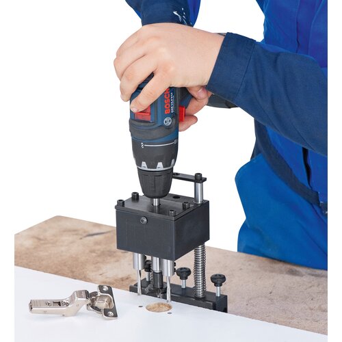 The drill head for hinges type Blum or Grass features three spindles and is suitable for simultaneous drilling of the three holes which are needed for mounting the hinges.