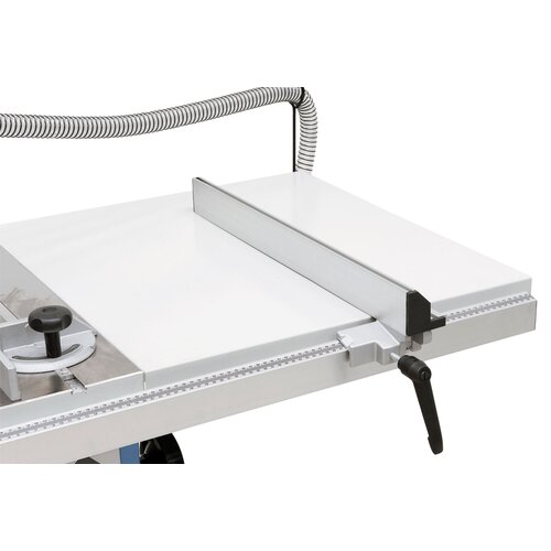 - Solid grey cast-iron table with T-slots for cutting with the mitre fence left and right of sawblade